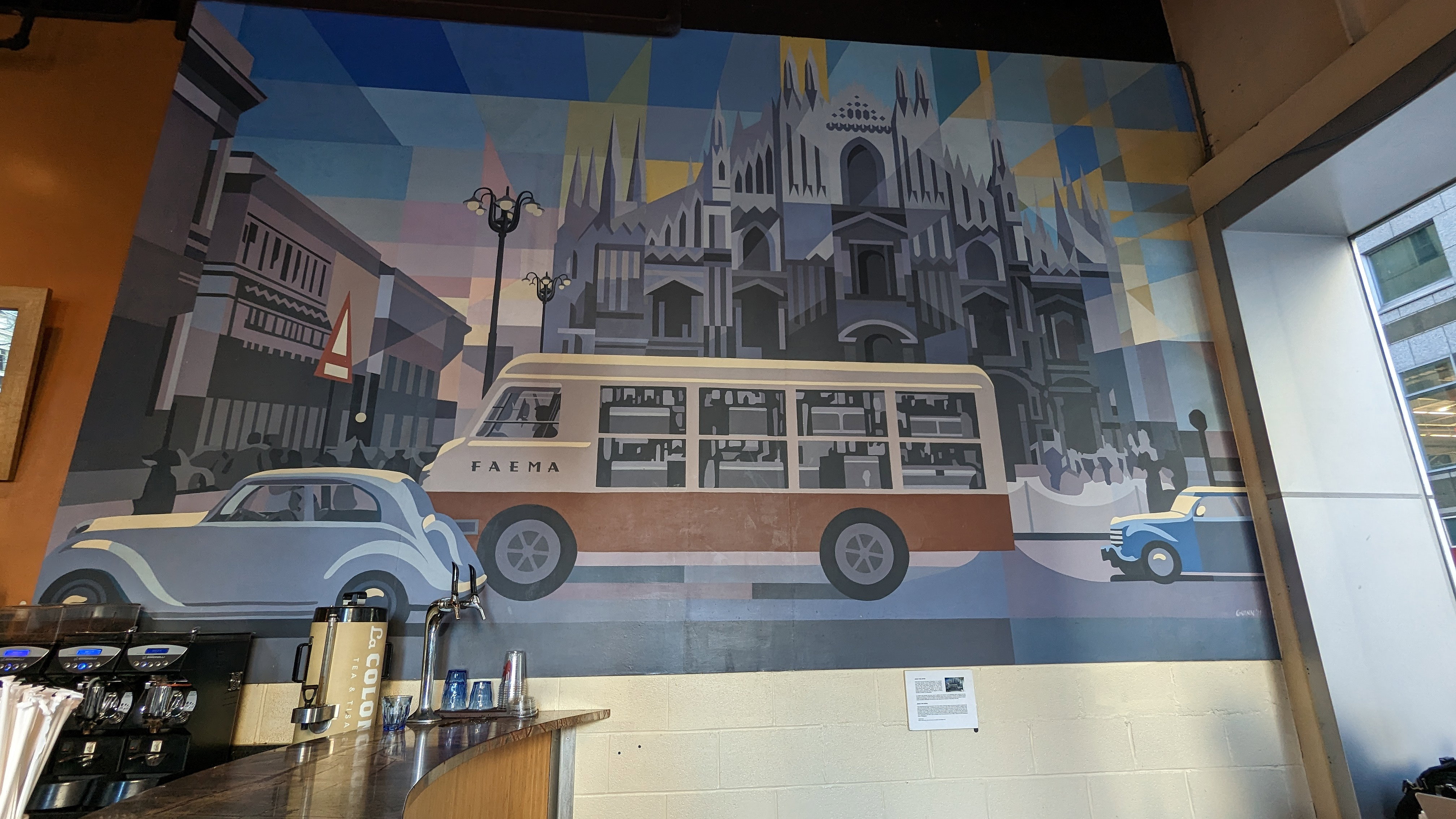 We got two oat milk mochas. This one is right across from City Hall and very busy.